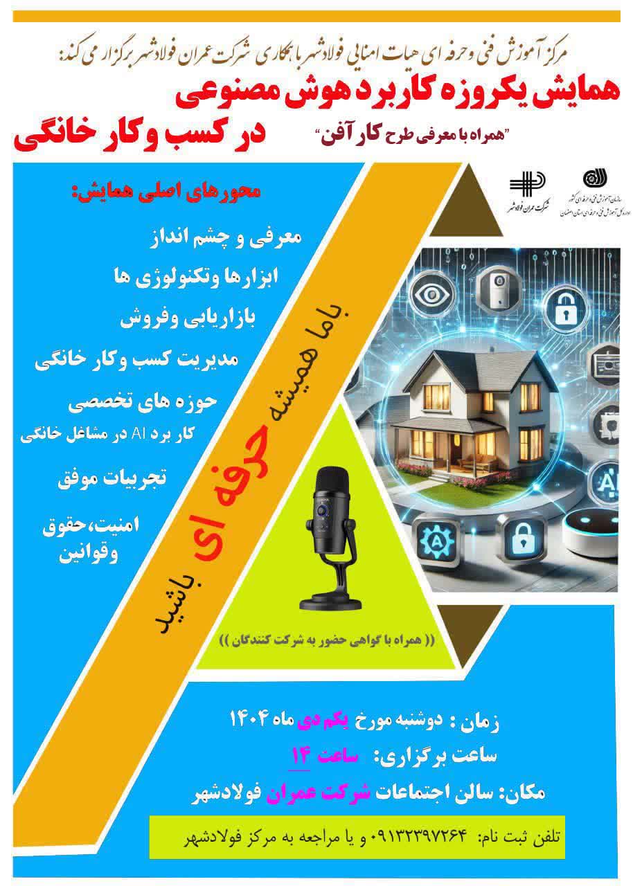 همایش آموزشی «هوش مصنوعی در کسبوکارهای خانگی» با همکاری مرکز آموزش فنیوحرفهای هیات امنایی فولادشهر و دفتر توسعه اجتماعی و فرهنگی شرکت عمران شهر جدید فولادشهر، با استقبال پرشور ۱۲۰ کارآفرین و فعال حوزه مشاغل خانگی برگزار شد.